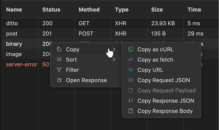 Right clicking on the network log opens Context Menu, allowing for sorting and filtering the logs, copying the request details, refetching and opening responses in the editor's tab.