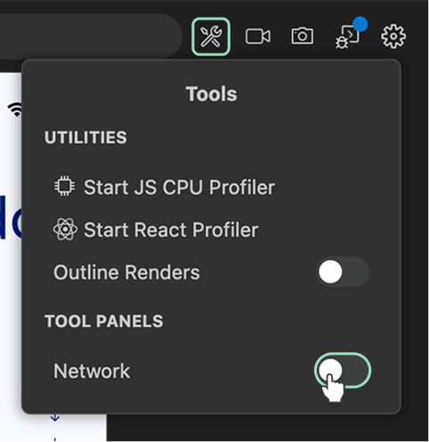 To enable the Network Inspector tab, first click the Tools button located on the top-right corner of the IDE. Then, enable the toggle next to the Network label. A new Network tab will appear in your editor.